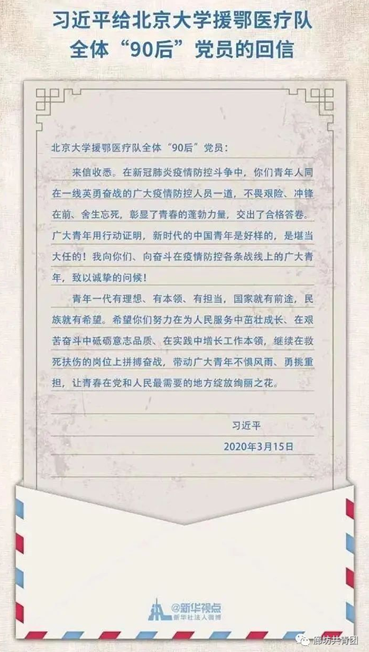 3月15日,习近平总书记给北京大学援鄂医疗队全体“90后”党员回信,向他们和奋斗在疫情防控各条战线上的广大青年致以诚挚的问候。习近平总书记在回信中指出,青年一代有理想、有本领、有担当,国家就有前途,民族就有希望。希望你们努力在为人民服务中茁壮成长、在艰苦奋斗中砥砺意志品质、在实践中增长工作本领,继续在救死扶伤的岗位上拼搏奋战,带动广大青年不惧风雨、勇挑重担,让青春在党和人民最需要的地方绽放绚丽之花。党旗所指就是团旗所向,团员青年是助推我院发展的中坚力量,为充分发挥团员青年生力军作用,在此,向全院团员青年们发出倡议: